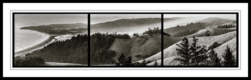 Combined from 3 film exposures created in the 1990s. this sweeping view of Bolinas Bay and Stinson Beach takes the eye all the way north past the Point Reyes Headlands to the Inverness Ridge This newly compiled image features a single window mat. It is also available with white borders and separators, both versions come in several sizes.